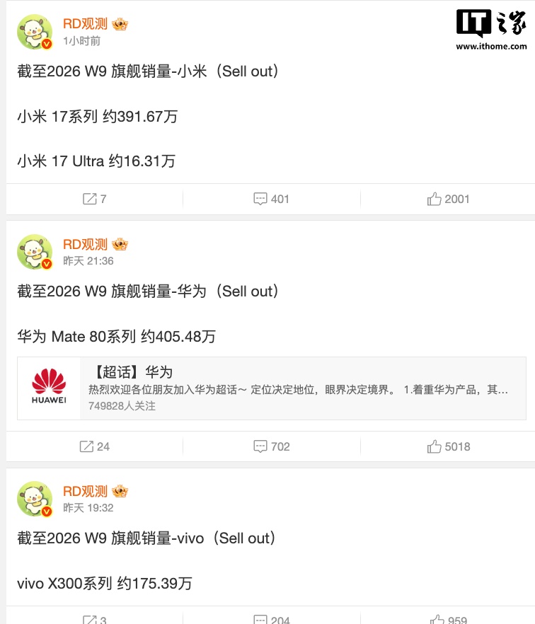 IT之家 3 月 8 日消息,长期关注国内手机市场份额的微博博主 @RD观测 今天发布了多个品牌最新旗舰机型的销量数据,统计截至 2026 年第九周。
