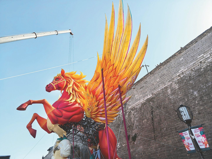 一月十一日,老门东城墙下的巨型飞马灯正在安装翅膀。十