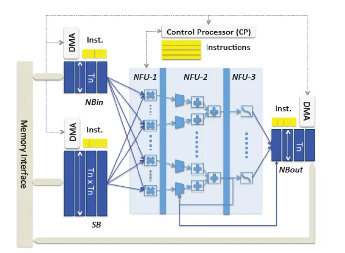 多核NPU的核心是大量的并行计算单元,这些单元通常被设计为向量处理器或矩阵处理器。例如,DianNao架构中,NFU(Neural Functional Units)分为乘法单元、加法树和激活单元。其中乘法单元包含256个乘法器,能够在每个时钟周期同时执行256个乘法操作。这些计算单元能够高效地执行大规模矩阵运算,从而加速神经网络的训练和推理过程。