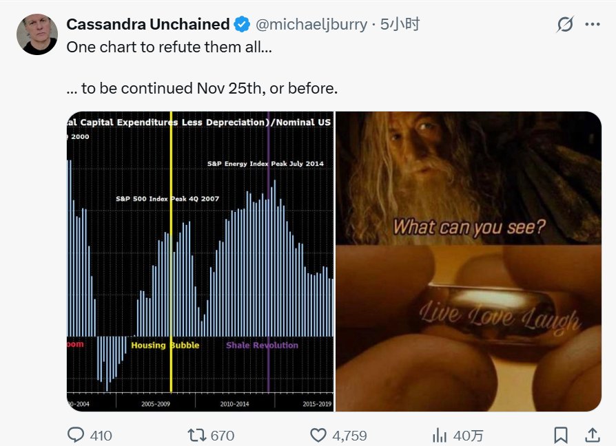 Burry曾于11月11日发文指出,科技巨头通过“人为”延长资产“有效使用寿命”来低估折旧,从而抬高利润,这是“现代最常见的诈欺(common frauds)之一”。他预计,到2028年,甲骨文(Oracle)的盈利可能被夸大26.9%,Meta则被夸大20.8%,甚至情况可能更糟。Burry当时未详细说明原因,只表示更多详情将于11月25日发布。