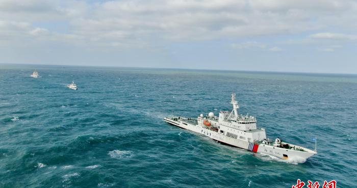 图为参与行动的“海巡06”轮(右一)、“东海救115”轮(中)、“海巡0802”轮列队前行。(无人机照片)中新社记者 王东明 摄