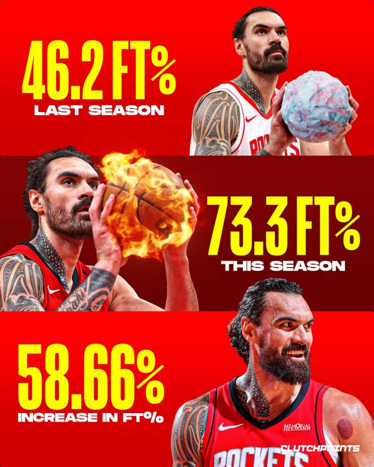 亚当斯上赛季罚球命中率46.2%,本赛季73.3%,进步幅度58.66%(46.2%×58.66%+46.2%=73.3%);生涯罚球命中率为53.3%