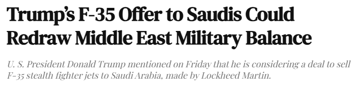 欧洲《现代外交》(Modern Diplomacy)网站的文章认为,特朗普向沙特出售 F-35 战机的提议或将重塑中东军事平衡。