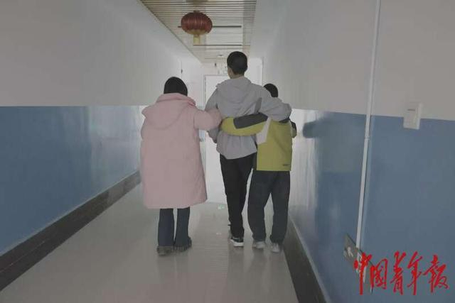 2月6日,宁夏回族自治区固原市儿童福利院,一个男孩(中)此前活动时脚部受伤,护工(左)和另一个男孩(右)搀扶他行走。中青报·中青网记者 焦敏龙/摄