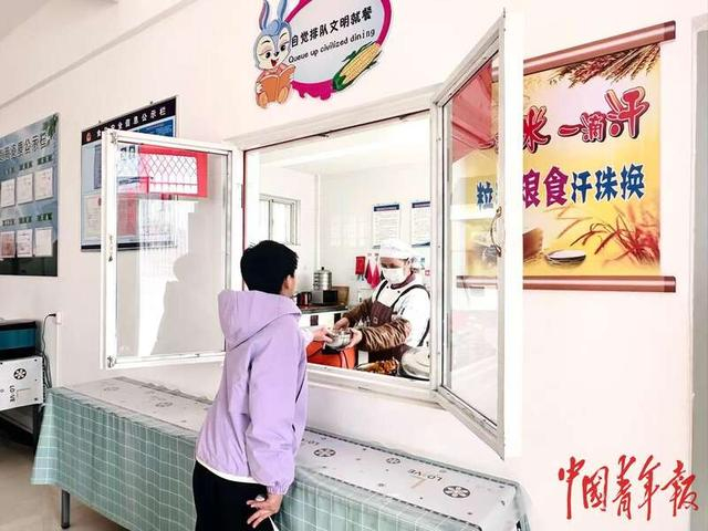 2月6日,宁夏回族自治区固原市儿童福利院,女孩儿在餐厅窗口等候取餐,当天的午餐是大盘鸡和米饭。中青报·中青网记者 焦敏龙/摄